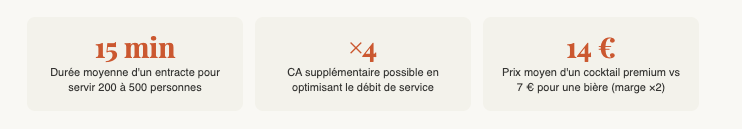 Pourquoi ? Parce que l’offre cocktail classique — shakers, doseurs, ingrédients frais, glace à gérer — est structurellement inadaptée aux pics d’affluence massifs. Le résultat est brutal :